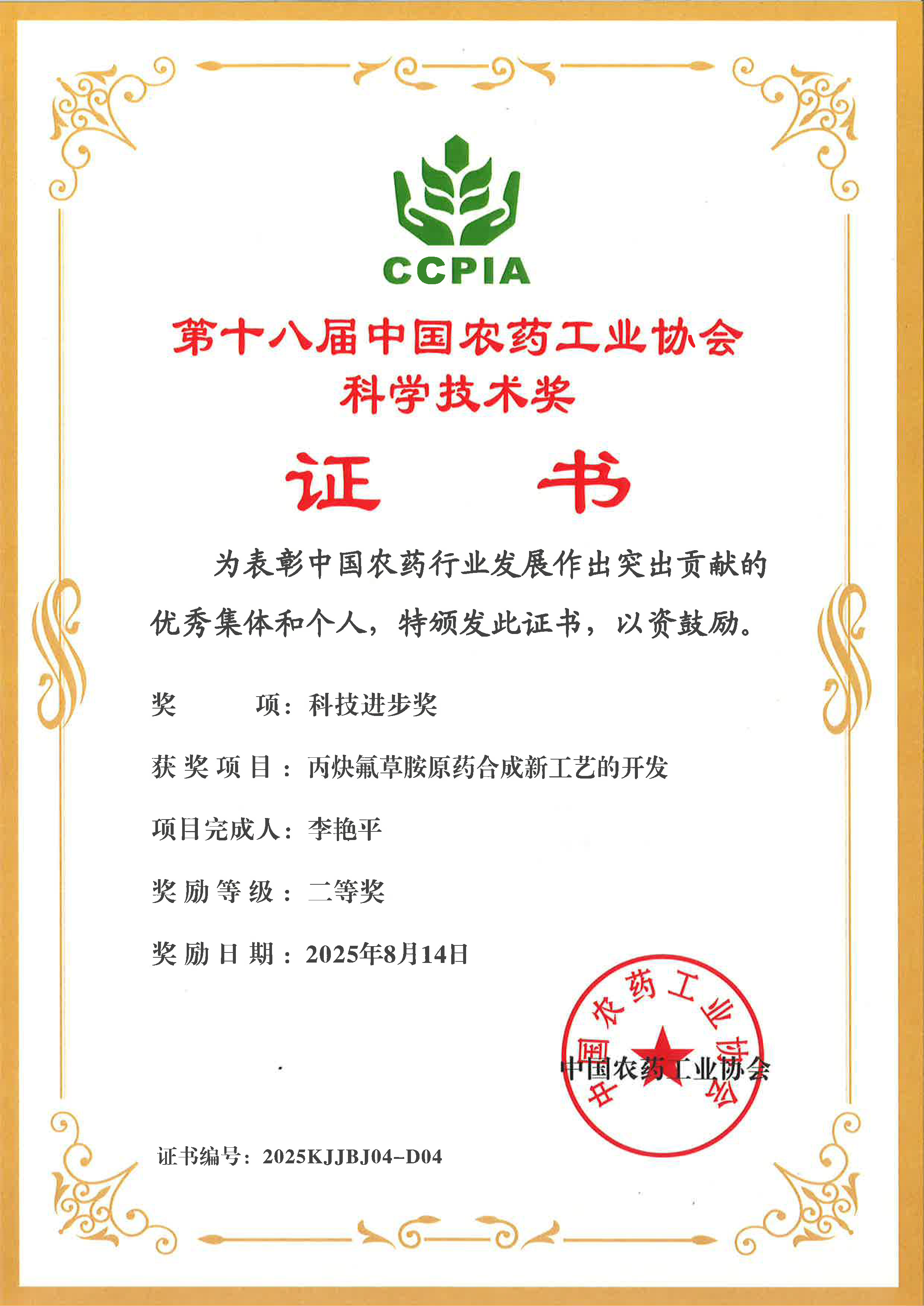 ■2025-09-09 我公司丙炔氟草胺原藥合成新工藝的開發(fā)項(xiàng)目榮獲第十八屆中國農(nóng)藥工業(yè)協(xié)會科