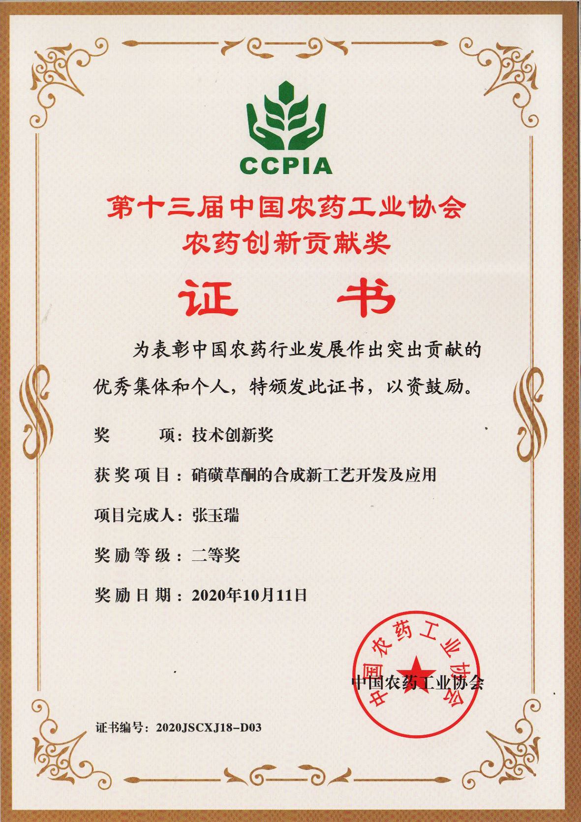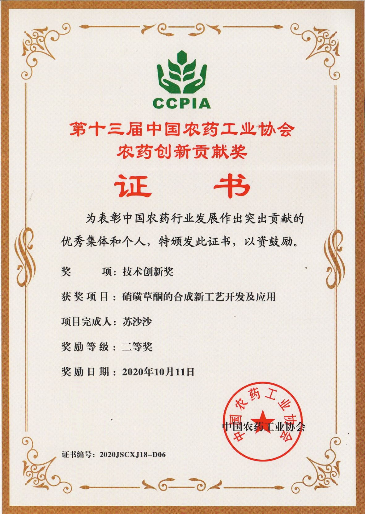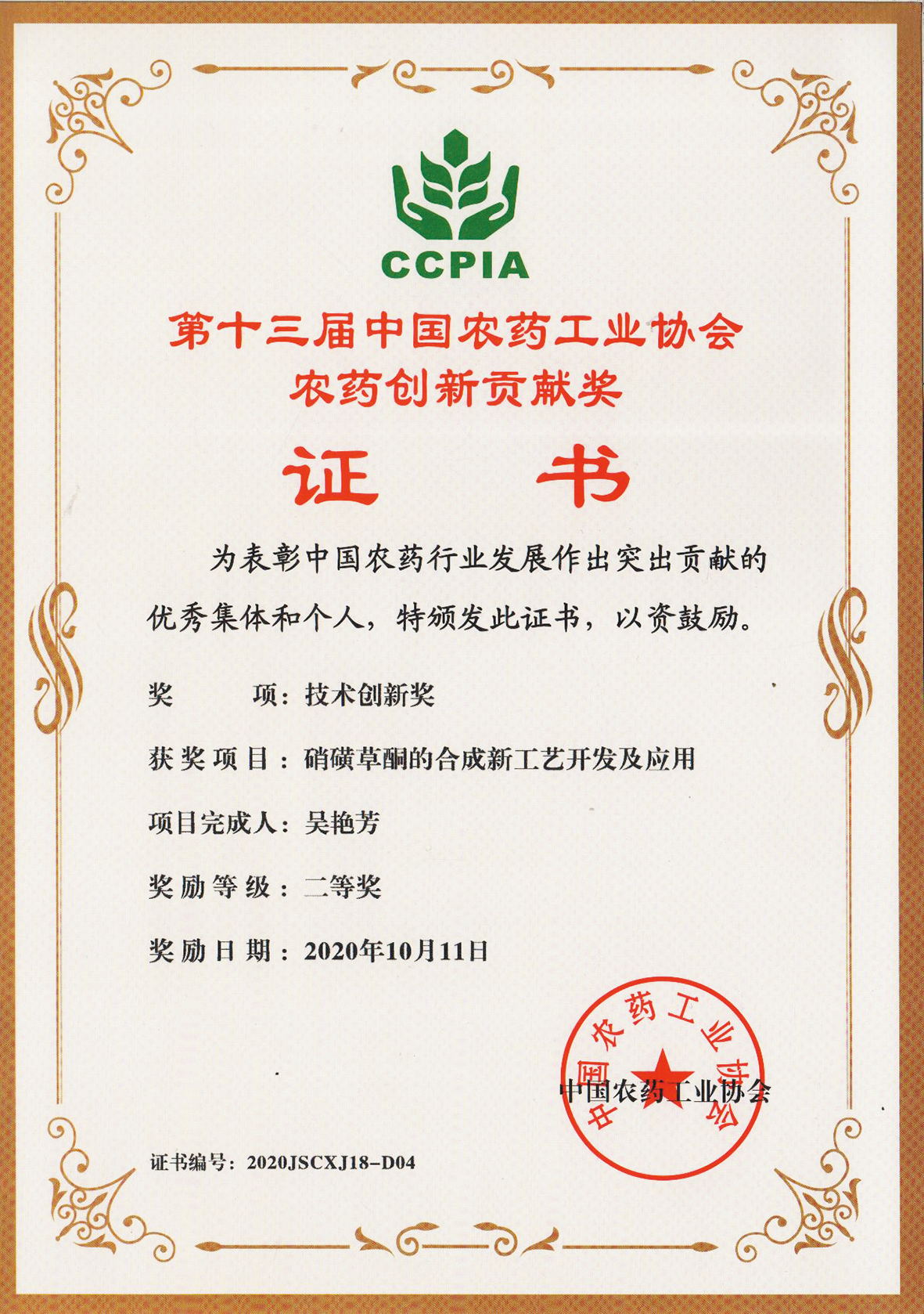 ■2020-11-05 我公司“硝磺草酮的合成新工藝開發(fā)及應用”項目榮獲技術創(chuàng)新獎