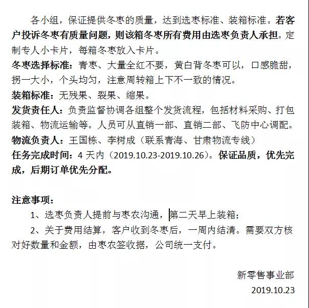 分工協(xié)作加上同事們高昂的工作勁頭,極大地提高了工作效率,歷時三天,萬箱經(jīng)過層層篩選的冬棗順利發(fā)出。物流承載的不僅僅是棗,更是新零售事業(yè)部全體人員的努力付出,在這三天里,有同事早晨來不及吃早飯,只能擠出時間吃個包子,公益服務,卻也視為責任!